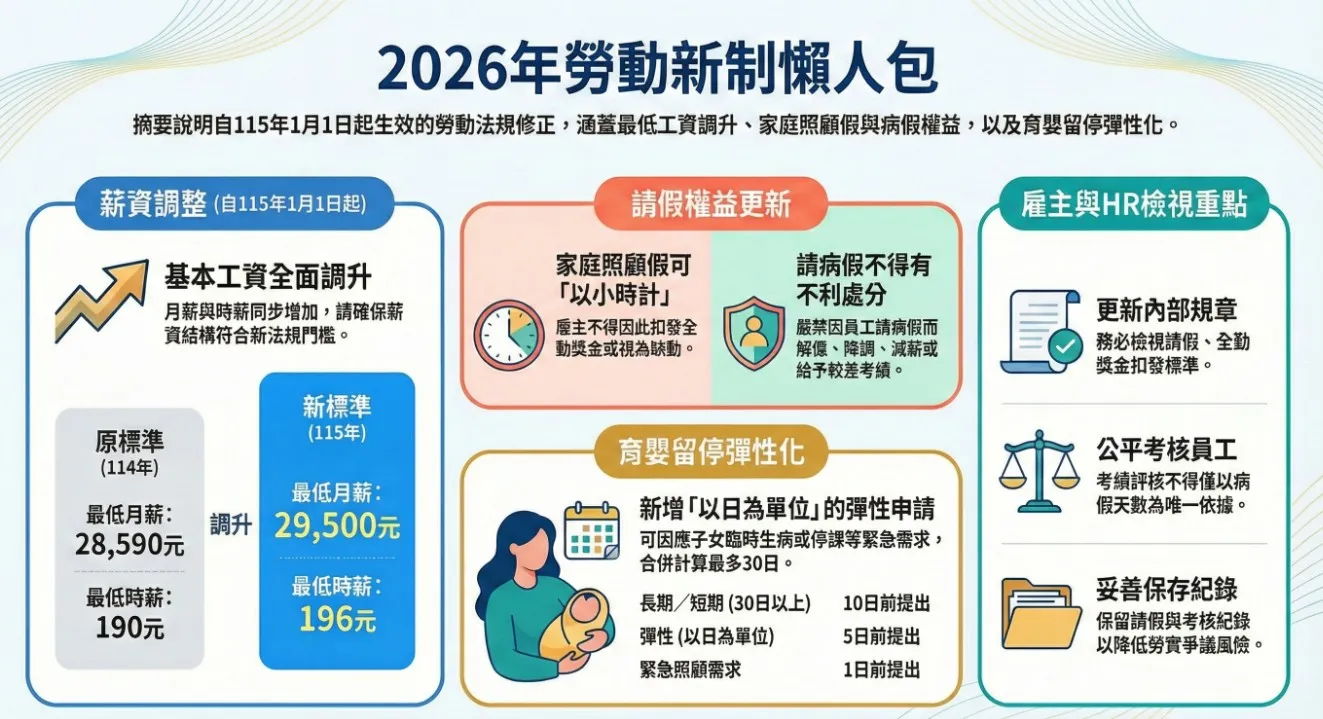 摘要說明自115年1月1日起生效的勞動法規修正,涵蓋最低工資調升、 家庭照顧假與病假權益,以及育嬰留停彈性化。